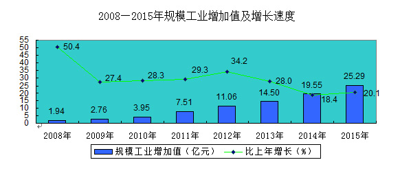 2015年,实现工业增加值26.5亿元,增长16.6%。其中,规模以上工业增加值25.29亿元,增长20.1%。全县规模以上工业企业累计完成工业总产值78.81亿元,增长31.7%。重工业产值57.64亿元,增长32.9%;轻工业产值21.17亿元,增长28.8%;实现利润51283.9万元,增长48.8%,实现税金40860.2万元,增长20.1%。总资产贡献率24.75%;资产保值增值率165.38%;资产负债率49.11%;流动资产周转率4.39次;成本费用利润率8.2%;产销率93.1%;全员劳动生产率558155元/人。主营业务收入利润率7.49%,人均主营业务收入1509.97千元, 每百元资产实现的主营业务收入165.38元。