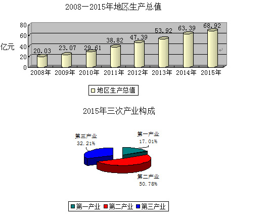 2015年,全年地区生产总值68.92亿元,按可比价格计算,比上年增长11.6%,呈现稳定增长的态势。分产业看,第一产业增加值11.72亿元,增长5.1%,对GDP增长的贡献率为-2.53%,拉动经济增长-0.29个百分点;第二产业增加值35.00亿元,增长15.8%,对GDP增长的贡献率为66.18%,拉动经济增长7.68个百分点;第三产业增加值22.20亿元,增长10.3%,对GDP增长的贡献率为36.35%,拉动经济增长4.21个百分点。一、二、三产业的比重为17.01:50.78:32.21,一产比重比上年降低1.70个百分点,二产、三产比重分别比上年上升1.34和0.36个百分点。非公经济不断发展壮大,2015年,全县非公经济实现增加值36.58亿元,占GDP比重为53.08%,比上年提高1.28个百分点。总体看来,经济继续稳中趋好,增速分别比全国、全省、全市高出4.7个、3.6个和0.4个百分点,保持了快速、持续和协调发展的态势。