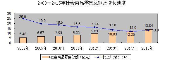 2015年,全县实现社会消费品零售总额13.84亿元,比上年增长13.0%。城镇消费品市场继续扩大,农村市场趋于活跃。城镇消费品零售额8.98亿元,增长10.1%,占零售总额的64.9%;乡村零售额4.86亿元,增长18.8%,占零售总额的35.1%。批零贸易零售额12.50亿元,增长13.5%,住宿餐饮业零售额1.34亿元,增长9.1%,低于社会消费品零售总额增幅3.9个百分点。