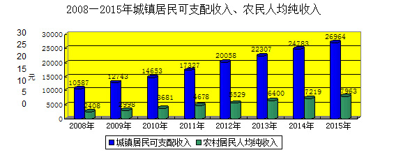 城乡居民生活水平继续提高。2015年,农民人均纯收入7963元,增长10.3%。城镇居民可支配收入26964元,增长8.8%。