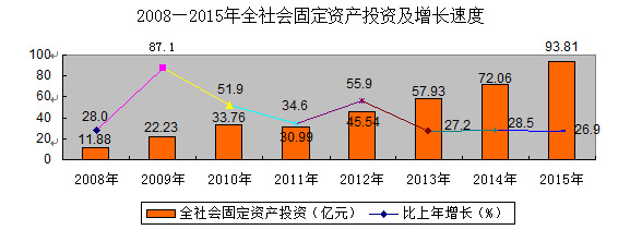 2015年,完成全社会固定资产投资93.81亿元,比上年增长26.9%;其中城镇固定资产投资91.94亿元,增长27.6%。第一产业投资12.82亿元,增长244.3%,第二产业投资33.82亿元,增长8.3%,第三产业投资45.30亿元,增长22.1%。按构成分:建筑工程76.65亿元,增长46.8%;安装工程2.23亿元,下降72.7%;设备工器具购置7.90亿元,增长57.4%;其他费用5.16亿元,下降22.4%。重大项目进展加快。全年,计划总投资在亿元以上新开工项目26个,比上年增加8个,占总项目个数的17.11%,完成投资63.75亿元,占固定资产投资完成总额的67.96%。基础设施投资加大。城区垃圾收集系统、农村饮水安全、土地开发治理、地质灾害治理、“七沟一河”防洪综治、县城排污管网改造等工程以及西街棚户区改造拆迁安置均按进度完成。其中:金丝峡综合服务区建设完成投资2.2亿元、金福湾保障房配套设施投资1.45亿元、高端富氢水项目完成投资1.5亿元、锦园山水城中村改造投资2.57亿元、棚户区改造完成投资5.5亿元、绿化造林完成投资2.25亿元。民生投资增加。防洪治理完成投资1.61亿元、陕南移民搬迁完成投资2.29亿元。本年施工项目153个,投产项目132个。