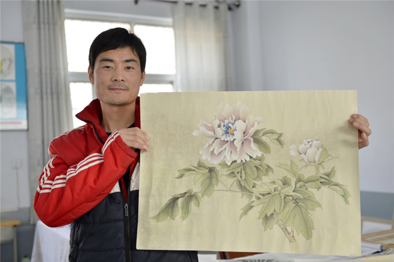 1月21日,宁晋县工笔画艺术学校一位残疾学员展示自己创作的工笔画作品。