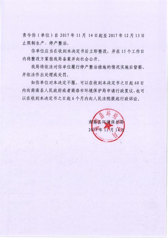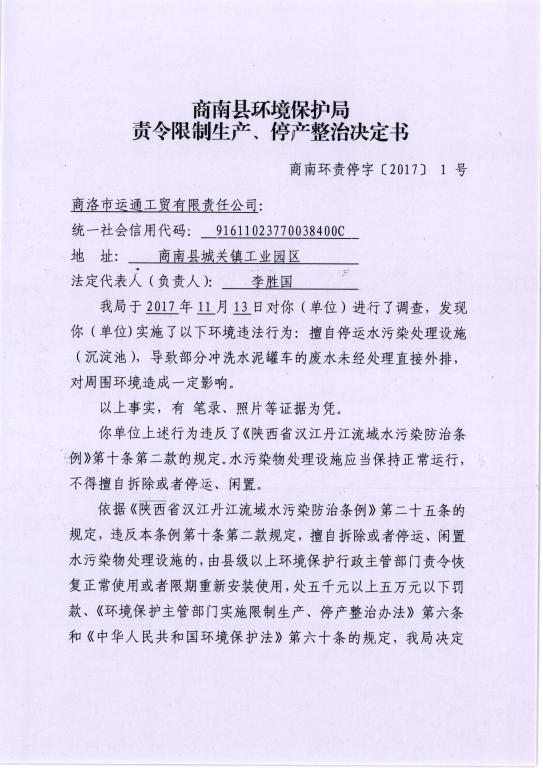 商洛市运通工贸有限责任公司责令限制生产、停产整治决定书