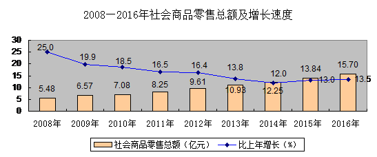 2016年,全县实现社会消费品零售总额15.70亿元,比上年增长13.5%。城镇消费品市场继续扩大,农村市场趋于活跃。城镇消费品零售额10.52亿元,增长17.2%,占零售总额的67.0%;乡村零售额5.18亿元,增长6.0%,占零售总额的33.0%。批零贸易零售额13.85亿元,增长10.8%,住宿餐饮业零售额1.85亿元,增长38.3%。