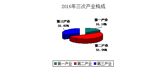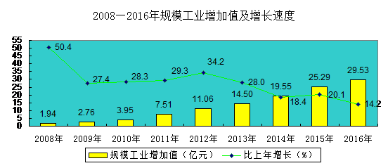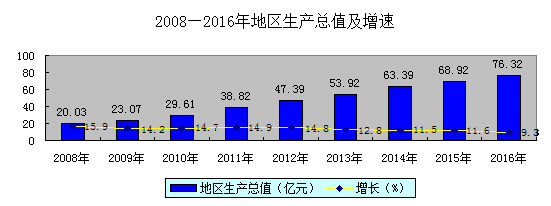 2016年,全年地区生产总值76.32亿元,按可比价格计算,比上年增长9.3%,呈现稳定增长的态势。分产业看,第一产业增加值12.32亿元,增长4.1%,对GDP增长的贡献率为8.1%,拉动经济增长0.7个百分点;第二产业增加值39.68亿元,增长12.6%,对GDP增长的贡献率为63.2%,拉动经济增长5.9个百分点;第三产业增加值24.32亿元,增长6.9%,对GDP增长的贡献率为28.7%,拉动经济增长2.7个百分点。一、二、三产业的比重为16.14:51.99:31.87,一产比重比上年降低0.87个百分点,二产比重比上年上升1.21个百分点,三产比重比上年降低0.34个百分点。非公经济不断发展壮大,2016年,全县非公经济实现增加值41.34亿元,占GDP比重为54.17%,比上年提高1.09个百分点。战新产业增长15.8%。总体看来,经济继续稳中向好,增速分别比全国、全省高出2.6个、1.7个百分点、比全市低0.7个百分点,保持了快速、持续和协调发展的态势。