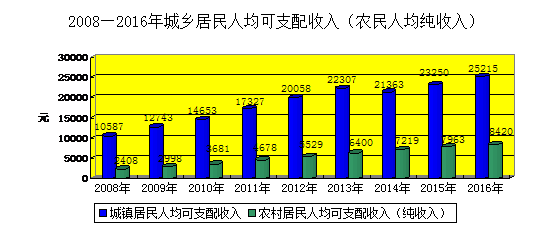 城乡居民生活水平继续提高。2016年,全体居民人均可支配收入13703元,增长8.9%,其中,农村居民人均可支配收入8420元,增长8.8%,城镇居民人均可支配收入25215元,增长8.5%。