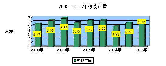 粮油产量平稳增长。全年粮食产量57209吨,比上年增长1.2%。其中夏粮产量28309吨,下降0.45%,秋粮产量28900吨,增长2.85%。油料产量14109吨,增长14.5%,夏季油料(油菜籽)产量2394吨,增长10.17%,秋季油料产量11715吨,增长15.41%。蔬菜产量72978吨,增长3.5%,其中食用菌产量4963吨,增长17.5%;茶叶产量2212吨,增长9.3%;中药材产量23962吨,增长2.9%。