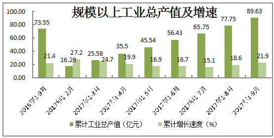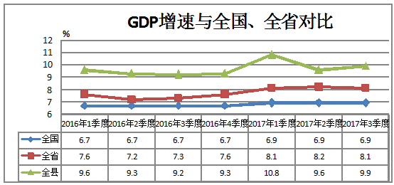 (一)经济运行稳中向好。前三季度完成生产总值57.84亿元,同比增长9.9%,增速分别高于全国、全省、全市3.0个、1.8个和0.1个百分点,较上年同期加快0.7个百分点、比一季度回落0.9个百分点、比上半年回升0.3个百分点。