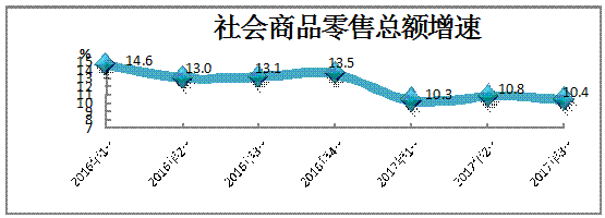 (五)消费品市场持续活跃。实现社会消费品零售总额122471.5万元,增长10.4%,比同期、上半年分别回落2.7个、0.4个百分点。商品零售105734.7万元,增长10.0%,餐饮收入16736.8万元,增长12.9%。城镇零售额83559.1万元,增长10.3%;乡村零售额38912.4万元,增长10.7%。限额以上社会消费品零售总额2.34亿元,增长17.5%。