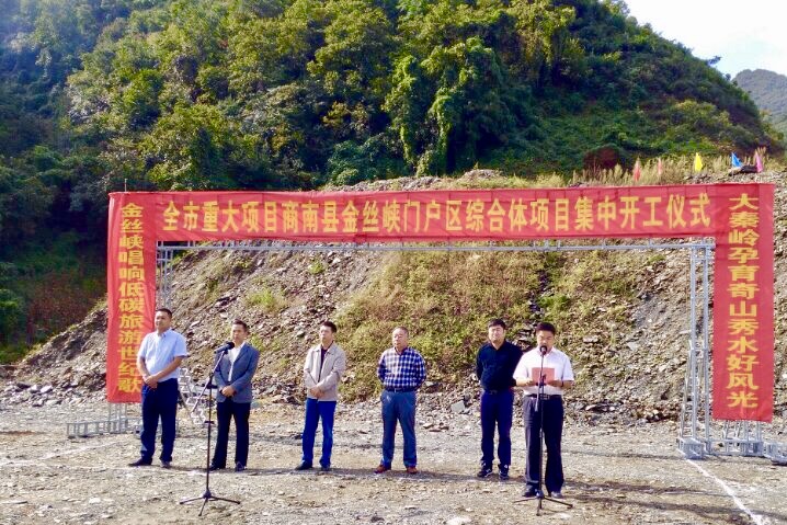 丹桂飘香,金秋送爽。9月28日,全市重大项目商南县金丝峡门户区综合体项目开工仪式隆重举行。县人大常委会副主任全强胜、金丝峡景区管委会党支部书记张仲才和县旅发委、金丝峡镇党委政府、商洛市柏伦工贸有限责任公司、金丝峡旅游发展有限责任公司等部门单位负责人参加了开工仪式。开工仪式由金丝峡景区管委会副主任蒋贻忠主持开工仪式,商洛市柏伦工贸有限责任公司总经理夏飞介绍了项目情况,县旅发委主任朱峰就项目包抓工作作了发言,金丝峡镇党委书记郑祎春就环境保障进行表态发言。